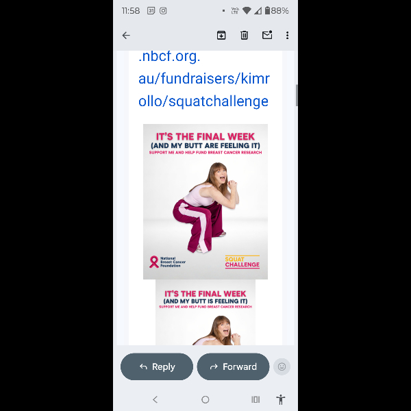 56 Australians will be diagnosed with breast cancer today and a further 9 will die. I want to make a difference to the lives of those 56 Australians impacted by the disease - that is why I am taking on the Squat Challenge to raise vital funds for world-class breast cancer research. But I need your help.