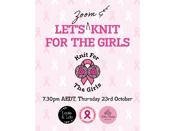 Join us for a Knit for the Girls 'virtual knit night' next Thursday, 23rd October @ 7.30pm AEDT (Sydney/Melbourne/Hobart time), hosted on Zoom by the fabulous Gayann of Fibremates, in support of the National Breast Cancer Foundation (NBCF).